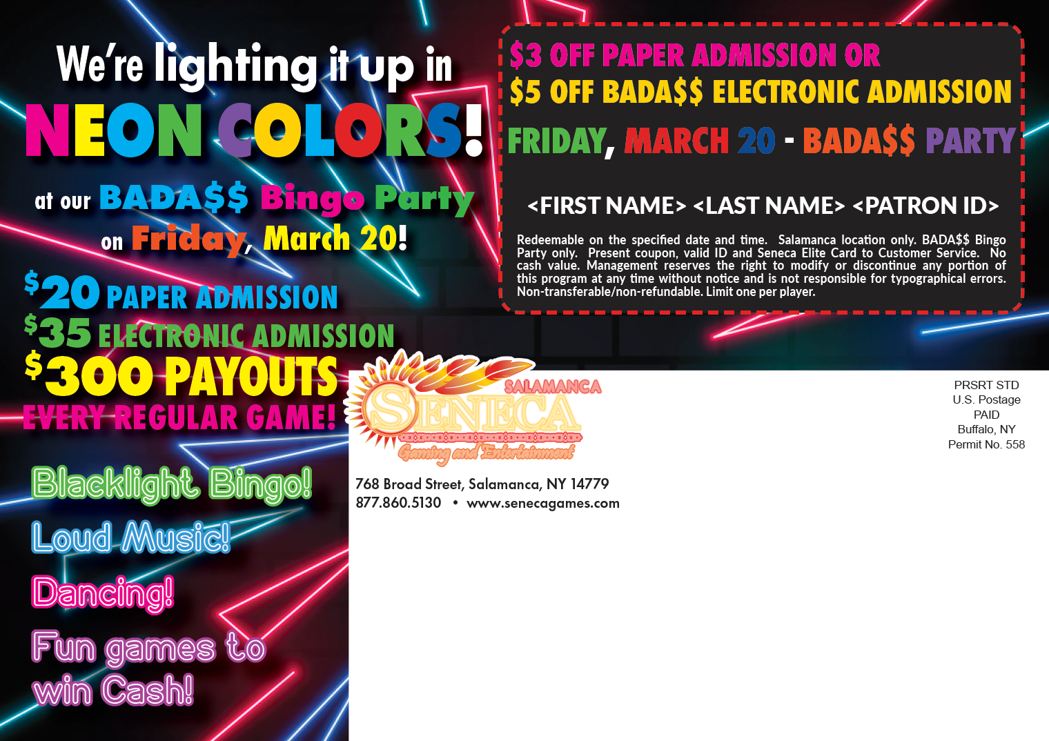 designed an event mailer for members of theĀ Seneca Salamanca elite club. Created a theme concept for specific promotional events that would include members only offers.